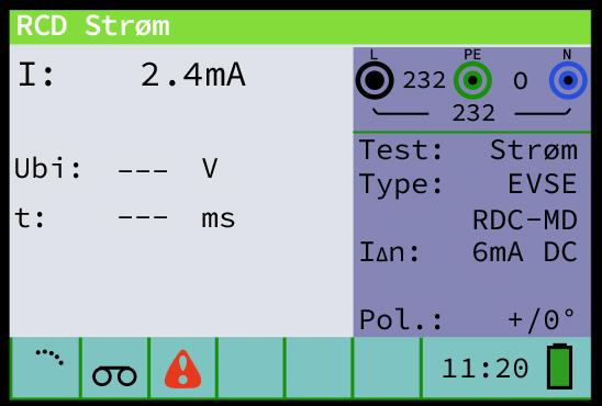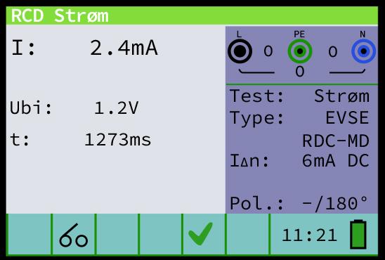 Test af udkoblingsstrøm ved rampetest med DC-teststrøm fra <2 mA til 6 mA på 30 sekunder; beskyttelsesfunktionen skal koble ud mellem 3 mA og 6 mA.