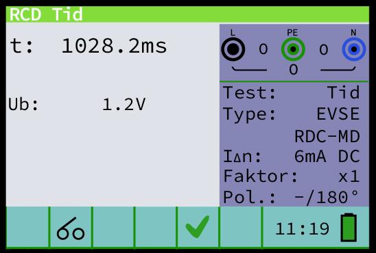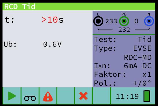 Test af udkoblingstid ved mærkeudløsestrøm, 6 mA; beskyttelsesfunktionen skal koble ud inden 10 sekunder.