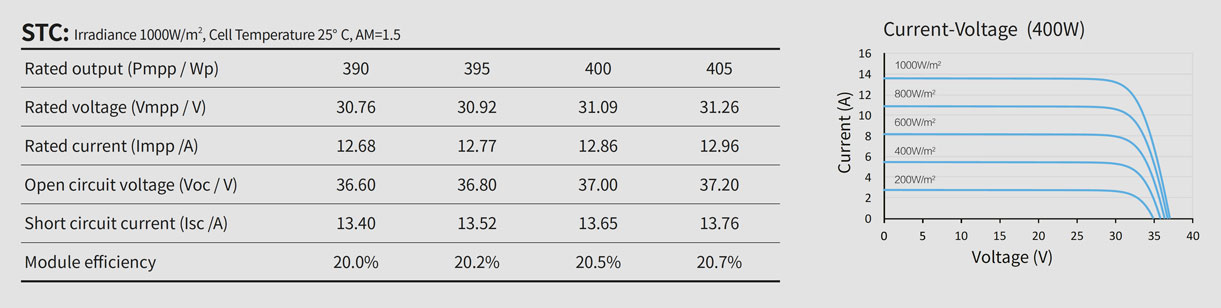 For at få den mest korrekte måling anbefaler vi at bruge en solcelletester, som måler spænding, strøm, solintensitet og temperatur samtidig. Virkningsgraden er forholdet mellem den målte effekt (Pmpp) og den opgivne effekt, men beregnes af solcelletesteren.